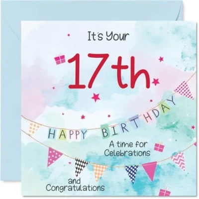 MAKE HIM SMILE WITH THIS UNIQUE BIRTHDAY CARD: This exceptional quality birthday card for him shows the design 'Its your 17th Happy Birthday A time for celebrations and congratulations'. If you are looking for special birthday greetings cards for Boys birthday card then then this happy birthday card is bound to make him smile. Not just for birthday gifts for Boys this could also be for Son, Godson, Step Son, Nephew, Cousin, Grandson, Great Nephew or Brother. WHAT DO YOU GET: The card is printed on one side and BLANK ON THE INSIDE to allow you to write your very own message. The unique fun design is printed on a specially sourced and environmentally responsible board. At 360 microns thick the natural white one-sided gloss board has a quality look and feel. Supplied with a coloured gummed envelope to complement the design and ready to be sealed and sent in the post. Great Son birthday cards, 17th birthday card, Godson birthday card. DESIGNED FOR WRITING: There is nothing worse than writing inside a card to find that the shiny surface makes the ink smudge. This is why we use a high quality one sided coated board. The uncoated side will absorb more of the ink from your pen to make smudging a thing of the past. 17th Birthday card for Step Son, 17th Birthday card for Nephew, 17th Birthday card for Cousin. SIZES: Greeting Card = 145mm x 145mm, Envelope = 155mm x 155mm, Card Thickness = 360 micron. Grandson 17th birthday card, birthday cards for Great Nephew, cute birthday cards for Brother, 17th birthday card Son, Godson 17th birthday card. MADE AND QUALITY CHECKED IN THE UK: We print and manufacture all our products right here in the UK so you can be sure of a fast turnaround and a product that is expertly made. Using environmentally responsible premium board our card is conscious of the responsible management of the world's forests - perfect birthday cards for Boys, fun birthday cards for him, Godson 17th birthday cards, female birthday cards.