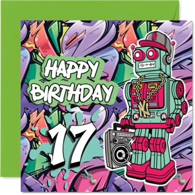 17th Birthday Cards for Boys Wicked Graffiti Robot Happy Card 17 Year Old Boy Step Son Grandson Nephew, 145mm Bday Greeting