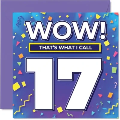 MAKE THEM SMILE WITH THIS UNIQUE BIRTHDAY CARD: This exceptional quality birthday card for him or her shows the design 'Wow! That?s What I Call 17'. If you are looking for special birthday greetings cards for Boys birthday card then then this happy birthday card is bound to make them smile. Not just for birthday gifts for Boys this could also be for Grandson, Cousin, Daughter, Nephew, Sister, Granddaughter, Brother or Niece. WHAT DO YOU GET: The card is printed on one side and BLANK ON THE INSIDE to allow you to write your very own message. The unique fun design is printed on a specially sourced and environmentally responsible board. At 360 microns thick the natural white one-sided gloss board has a quality look and feel. Supplied with a coloured gummed envelope to complement the design and ready to be sealed and sent in the post. Great Grandson birthday cards, Cousin birthday card. DESIGNED FOR WRITING: There is nothing worse than writing inside a card to find that the shiny surface makes the ink smudge. This is why we use a high quality one sided coated board. The uncoated side will absorb more of the ink from your pen to make smudging a thing of the past. 17th Birthday card for Daughter, 17th Birthday card for Nephew, 17th Birthday card for Sister. SIZES: Greeting Card = 145mm x 145mm, Envelope = 155mm x 155mm, Card Thickness = 360 micron. Granddaughter 17th birthday card, birthday cards for Brother, special birthday cards for Niece, 17th birthday card Grandson, Cousin 17th birthday card. MADE AND QUALITY CHECKED IN THE UK: We print and manufacture all our products right here in the UK so you can be sure of a fast turnaround and a product that is expertly made. Using environmentally responsible premium board our card is conscious of the responsible management of the world's forests - perfect birthday cards for Boys, fun birthday cards for him, Cousin 17th birthday cards, female birthday cards.