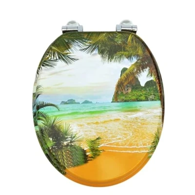 18" MDF Toilet SEAT Universal Adjustable Fit Most Toilets Oval Seat┃Bathroom Standard Wooden WC +Fittings (Tropical Landscape Beach)