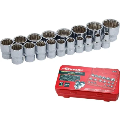 General description The Neilsen Metric Multi Drive Sockets set includes 18 pieces ranging from 6mm to 24mm. This versatile socket set is designed for use with various types of screws, including hex, double hex, T-STAR, metric, and inch sizes, thanks to its special "gear-lock-profile". Technical specifications Socket sizes: 6mm, 7mm, 8mm, 9mm, 10mm, 11mm, 12mm, 13mm, 14mm, 15mm, 16mm, 17mm, 18mm, 19mm, 20mm, 21mm, 22mm, 24mm Drive size: 3/8" Material: CRV (Chrome Vanadium)