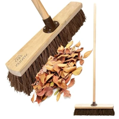 Versatile Heavy Duty Outdoor Broom - The 18 inches heavy duty stiff broom with natural bassine bristles can withstand the toughest jobs for outdoor cleaning. Whether you need to clean up your garden, patio, decking, pathways, or driveways, this yard brush heavy duty outdoor broom is versatile enough to handle it all. The natural bassine bristles are tough and durable, making them perfect for removing garden waste. High Quality Sturdy Support Bracket - The garden broom outdoor brush is equipped with a high-quality support bracket that not only holds the handle securely in place, but also ensures a sturdy fitment of the broom head to the handle, perfect for the toughest outdoor cleaning tasks. This ensures that you can use the yard broom outdoor heavy duty brush with confidence, knowing that it will stay securely in place as you sweep. Durable Long Wooden Broom Handle - The 120cm long handle on this outdoor yard broom deck brush makes it easy to use. Perfect for sweeping large outdoor areas. With this garden brush heavy duty outdoor broom you can sweep away debris and dirt without straining your back or bending over. This makes it a great outdoor yard brush for those who want to get their outdoor cleaning done quickly and efficiently. Premium Natural Bassine Bristle - The garden brush outdoor broom features stiff natural bassine bristles that are tough, durable, and perfect for removing dirt and debris from outdoor surfaces without damaging them. These hard brush bristles are perfect for sweeping away leaves, twigs, and other debris from your garden or patio. Furthermore, the natural bassine bristles on this outdoor brush heavy duty broom are well-suited for use in wet or dry conditions. Stiff Brush for Wet or Dry Use - This stiff broom outdoor brush is designed to be used in both wet and dry conditions. This means that you can use it to clean up everything from dry leaves and debris to wet mud and dirt. Whether you need to sweep away dry leaves in the fall or clean up a muddy pathway after a heavy rain, this sweeping brush outdoor broom has got you covered.