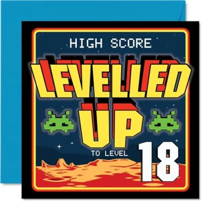 MAKE THEM SMILE WITH THIS UNIQUE BIRTHDAY CARD: This exceptional quality birthday card for him or her shows the design 'High Score LEVELED UP to age level 18'. If you are looking for special birthday greetings cards for Men birthday card then then this happy birthday card is bound to make them smile. Not just for birthday gifts for Men this could also be for Son, Niece, Daughter, Uncle, Cousin, Sister, Friend or Auntie. WHAT DO YOU GET: The cards are printed on both sides with the inside print saying 'Have an Epic Day' and ample space for your own personal message. The unique fun design is printed on a specially sourced and environmentally responsible board. At 360 microns thick the natural white one-sided gloss board has a quality look and feel. Supplied with a coloured gummed envelope to complement the design and ready to be sealed and sent in the post. NO INK SMUDGES: There is nothing worse than writing inside a card to find that the shiny surface makes the ink smudge. This is why we use a high quality one sided coated board. The uncoated side will absorb more of the ink from your pen to make smudging a thing of the past. 18th Birthday card for Daughter, 18th Birthday card for Uncle, 18th Birthday card for Cousin. SIZES: Greeting Card = 145mm x 145mm, Envelope = 155mm x 155mm, Card Thickness = 360 micron. Sister 18th birthday card, birthday cards for Friend, special birthday cards for Auntie, 18th birthday card Son, Niece 18th birthday card. MADE AND QUALITY CHECKED IN THE UK: We print and manufacture all our products right here in the UK so you can be sure of a fast turnaround and a product that is expertly made. Using environmentally responsible premium board our card is conscious of the responsible management of the world's forests - perfect birthday cards for Men, fun birthday cards for him, Niece 18th birthday cards, female birthday cards.