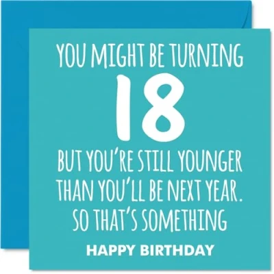MAKE THEM SMILE WITH THIS UNIQUE BIRTHDAY CARD: This exceptional quality birthday card for him or her shows the design 'You might be turning 18 but youre still younger than youll be next year. So thats something HAPPY BIRTHDAY'. If you are looking for special birthday greetings cards for Men birthday card then this happy birthday card is bound to make them smile. Not just for birthday gifts for Men this could also be for Son, Niece, Daughter, Uncle, Cousin, Sister, Friend or Auntie. WHAT DO YOU GET: The card is printed on one side and BLANK ON THE INSIDE to allow you to write your very own message. The unique fun design is printed on a specially sourced and environmentally responsible board. At 360 microns thick the natural white one-sided gloss board has a quality look and feel. Supplied with a coloured gummed envelope to complement the design and ready to be sealed and sent in the post. Great Son birthday cards, Niece birthday card. NO INK SMUDGES: There is nothing worse than writing inside a card to find that the shiny surface makes the ink smudge. This is why we use a high quality one sided coated board. The uncoated side will absorb more of the ink from your pen to make smudging a thing of the past. 18th Birthday card for Daughter, 18th Birthday card for Uncle, 18th Birthday card for Cousin. SIZES: Greeting Card = 145mm x 145mm, Envelope = 155mm x 155mm, Card Thickness = 360 micron. Sister 18th birthday card, birthday cards for Friend, special birthday cards for Auntie, 18th birthday card Son, Niece 18th birthday card. MADE AND QUALITY CHECKED IN THE UK: We print and manufacture all our products right here in the UK so you can be sure of a fast turnaround and a product that is expertly made. Using environmentally responsible premium board our card is conscious of the responsible management of the world's forests - perfect birthday cards for Men, fun birthday cards for him, Niece 18th birthday cards, female birthday cards.