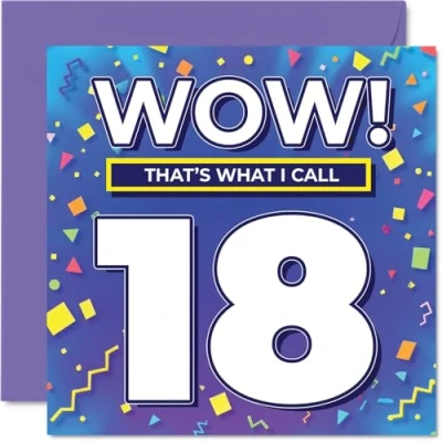 MAKE THEM SMILE WITH THIS UNIQUE BIRTHDAY CARD: This exceptional quality birthday card for him or her shows the design 'Wow! That?s What I Call 18'. If you are looking for special birthday greetings cards for Men birthday card then then this happy birthday card is bound to make them smile. Not just for birthday gifts for Men this could also be for Son, Niece, Daughter, Uncle, Cousin, Sister, Friend or Auntie. WHAT DO YOU GET: The card is printed on one side and BLANK ON THE INSIDE to allow you to write your very own message. The unique fun design is printed on a specially sourced and environmentally responsible board. At 360 microns thick the natural white one-sided gloss board has a quality look and feel. Supplied with a coloured gummed envelope to complement the design and ready to be sealed and sent in the post. Great Son birthday cards, Niece birthday card. DESIGNED FOR WRITING: There is nothing worse than writing inside a card to find that the shiny surface makes the ink smudge. This is why we use a high quality one sided coated board. The uncoated side will absorb more of the ink from your pen to make smudging a thing of the past. 18th Birthday card for Daughter, 18th Birthday card for Uncle, 18th Birthday card for Cousin. SIZES: Greeting Card = 145mm x 145mm, Envelope = 155mm x 155mm, Card Thickness = 360 micron. Sister 18th birthday card, birthday cards for Friend, special birthday cards for Auntie, 18th birthday card Son, Niece 18th birthday card. MADE AND QUALITY CHECKED IN THE UK: We print and manufacture all our products right here in the UK so you can be sure of a fast turnaround and a product that is expertly made. Using environmentally responsible premium board our card is conscious of the responsible management of the world's forests - perfect birthday cards for Men, fun birthday cards for him, Niece 18th birthday cards, female birthday cards.