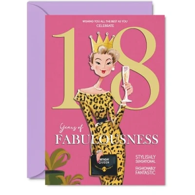 MAKE HER SMILE WITH THIS UNIQUE BIRTHDAY CARD: This exceptional quality birthday card for her shows the design 'Wishing you all the best as you celebrate 18 years of fabulousness'. If you are looking for special birthday greetings cards for Women birthday card then then this happy birthday card is bound to make her smile. Not just for birthday gifts for Women this could also be for Colleague, Friend, Granddaughter, Cousin, Sister, Auntie, Niece or Daughter. WHAT DO YOU GET: The cards are printed on both sides with the inside print saying 'Have a Luminously Lovely Day' and ample space for your own personal message. The unique design is printed on a specially sourced and environmentally responsible board. At 360 microns thick the natural white one-sided gloss board has a quality look and feel. Supplied with a coloured gummed envelope to complement the design and ready to be sealed and sent in the post. NO INK SMUDGES: There is nothing worse than writing inside a card to find that the shiny surface makes the ink smudge. This is why we use a high quality one sided coated board. The uncoated side will absorb more of the ink from your pen to make smudging a thing of the past. 18th Birthday card for Granddaughter, 18th Birthday card for Cousin, 18th Birthday card for Sister. SIZES: Greeting Card = 148mm x 210mm, Envelope = 150mm x 212mm, Card Thickness = 360 micron. Auntie 18th birthday card, birthday cards for Niece, cute birthday cards for Daughter, 18th birthday card Colleague, Friend 18th birthday card. MADE AND QUALITY CHECKED IN THE UK: We print and manufacture all our products right here in the UK so you can be sure of a fast turnaround and a product that is expertly made. Using environmentally responsible premium board our card is conscious of the responsible management of the world's forests - perfect birthday cards for Women, fun birthday cards for her, Friend 18th birthday cards, female birthday cards.