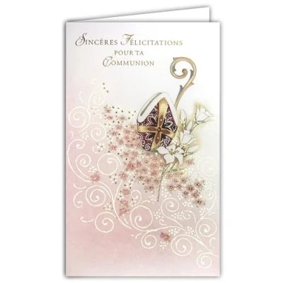 19 624 Congratulations on Your Communion Card with White Envelope 19.5 x 12 cm Pink Flowers for Girl Communiant Christian Catholic Cross Mitre Bishop