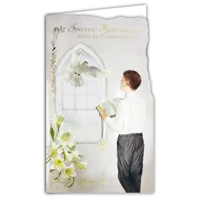 19 649 Card with Envelope Sincere Congratulations Communion Boy Christian Cross Catholic Rosary Our Father Hail Mary Bible Open Dove Flowers White Lily Made in Europe