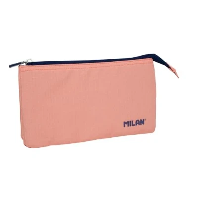 Pencil case with 3 zippers and 5 compartments, to be able to organize and distribute the contents. 1918 Series Pink Inspired by the original colors and design of the MILAN erasers, made in Spain since 1918. Navy blue patterned inner lining with a grid that evokes the shapes of MILAN rubbers. Ripstop outer fabric: lightweight and resistant to breakage and tears. It uses a special technique that weaves thick reinforcement threads at regular intervals in a crisscross pattern. Composition: outer and inner polyester lining. Fabric composition: outer and polyester inner lining. Measurements: 22 x 12 x 4 cm.