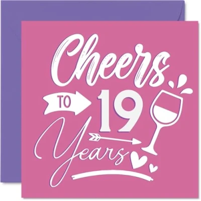 MAKE HER SMILE WITH THIS UNIQUE BIRTHDAY CARD: This exceptional quality birthday card for her shows the design 'Cheers to 19 Years'. If you are looking for special birthday greetings cards for Women birthday card then then this happy birthday card is bound to make her smile. Not just for birthday gifts for Women this could also be for Daughter, Sister, Cousin, Auntie, Niece, Colleague, Friend or Granddaughter. WHAT DO YOU GET: The card is printed on one side and BLANK ON THE INSIDE to allow you to write your very own message. The unique fun design is printed on a specially sourced and environmentally responsible board. At 360 microns thick the natural white one-sided gloss board has a quality look and feel. Supplied with a coloured gummed envelope to complement the design and ready to be sealed and sent in the post. Great Daughter birthday cards, 19th birthday card, Sister birthday card. NO INK SMUDGES: There is nothing worse than writing inside a card to find that the shiny surface makes the ink smudge. This is why we use a high quality one sided coated board. The uncoated side will absorb more of the ink from your pen to make smudging a thing of the past. 19th Birthday card for Cousin, 19th Birthday card for Auntie, 19th Birthday card for Niece. SIZES: Greeting Card = 145mm x 145mm, Envelope = 155mm x 155mm, Card Thickness = 360 micron. Colleague 19th birthday card, birthday cards for Friend, cute birthday cards for Granddaughter, 19th birthday card Daughter, Sister 19th birthday card. MADE AND QUALITY CHECKED IN THE UK: We print and manufacture all our products right here in the UK so you can be sure of a fast turnaround and a product that is expertly made. Using environmentally responsible premium board our card is conscious of the responsible management of the world's forests - perfect birthday cards for Women, fun birthday cards for her, Sister 19th birthday cards, female birthday cards.