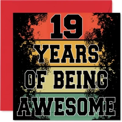 MAKE THEM SMILE WITH THIS UNIQUE BIRTHDAY CARD: This exceptional quality birthday card for him or her shows the design '19 Years Of Being Awesome'. If you are looking for special birthday greetings cards for Men birthday card then then this happy birthday card is bound to make them smile. Not just for birthday gifts for Men this could also be for Niece, Daughter, Uncle, Cousin, Sister, Friend, Auntie or Brother. WHAT DO YOU GET: The card is printed on one side and BLANK ON THE INSIDE to allow you to write your very own message. The unique fun design is printed on a specially sourced and environmentally responsible board. At 360 microns thick the natural white one-sided gloss board has a quality look and feel. Supplied with a coloured gummed envelope to complement the design and ready to be sealed and sent in the post. Great Niece birthday cards, Daughter birthday card. NO INK SMUDGES: There is nothing worse than writing inside a card to find that the shiny surface makes the ink smudge. This is why we use a high quality one sided coated board. The uncoated side will absorb more of the ink from your pen to make smudging a thing of the past. 19th Birthday card for Uncle, 19th Birthday card for Cousin, 19th Birthday card for Sister. SIZES: Greeting Card = 145mm x 145mm, Envelope = 155mm x 155mm, Card Thickness = 360 micron. Friend 19th birthday card, birthday cards for Auntie, special birthday cards for Brother, 19th birthday card Niece, Daughter 19th birthday card. MADE AND QUALITY CHECKED IN THE UK: We print and manufacture all our products right here in the UK so you can be sure of a fast turnaround and a product that is expertly made. Using environmentally responsible premium board our card is conscious of the responsible management of the world's forests - perfect birthday cards for Men, fun birthday cards for him, Daughter 19th birthday cards, female birthday cards.