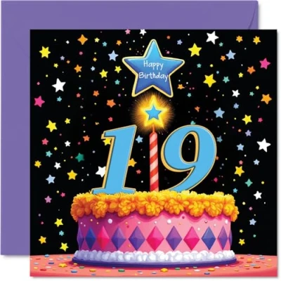 19th Birthday Cards for Women Men Pink Cake & Stars Happy Card 19 Year Old Woman Man Nephew Grandson Granddaughter Brother, 145mm Bday Greeting