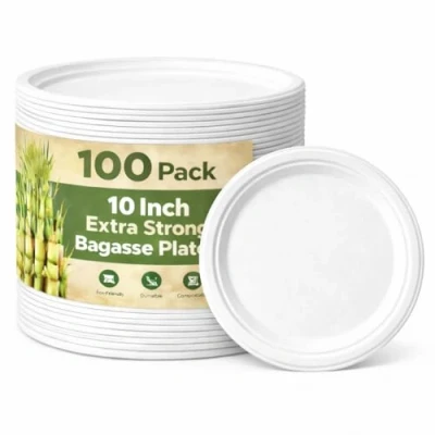 1ABOVE 100 Pack 10 Inch Extra Strong White Disposable Bagasse Plates Compostable & Biodegradable Sugarcane Fibre for BBQs, Weddings, Parties Picnics