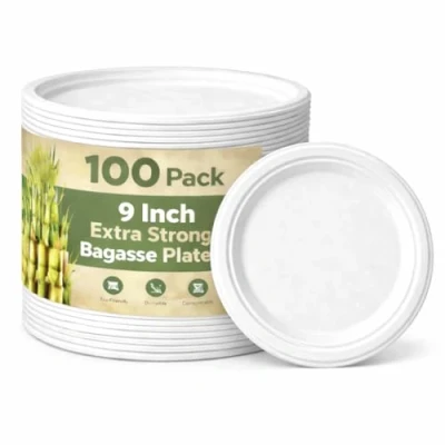 1ABOVE 100 Pack 9 Inch Extra Strong White Disposable Bagasse Plates Compostable & Biodegradable Sugarcane Fibre for BBQs, Weddings, Parties Picnics