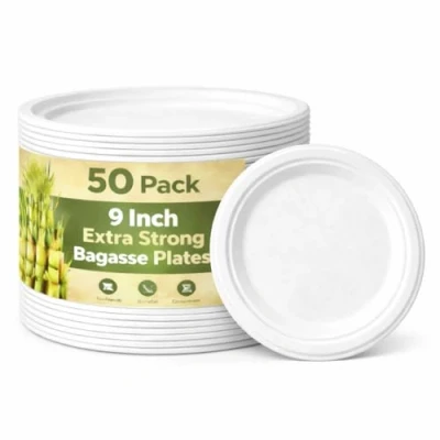 1ABOVE 50 Pack Extra Strong White Disposable Bagasse Plates, 100% Compostable and Biodegradable, Made from Sugarcane Fibre, Perfect for BBQ, Wedding, Office, Picnics Parties (9 INCH)