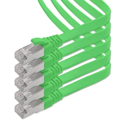1 m - green - pack of 5 Cat7 network cable, thin, flat, narrow patch cable, flat cable, flat ribbon cable, Ethernet cable, flat slim, compatible with Cat5 Cat5e Cat6 Cat6a Cat8 cable Network cable patch cable Ethernet cable for all internet speeds Cat.7 patch cable is extremely thin. Thanks to the flat design, these network cables can be laid under carpets, floors, laminate, parquet, skirting boards, wall strips, e.g. for Smart TV satellite receivers Cat.7 network cable easily connects Internet WiFi router repeater Telekom DSL modem Fritzbox notebook laptop PC computer gaming console Internet radio patch panel hub switch Network socket server patch panel multimedia device media player network printer printer print server patch panel and other devices with Rj45 connection Suitable for Base-T Ethernet networks 10/100/1000/10000 Mbit Nas devices Powerlan Ethernet drive card stick ISDN telephones