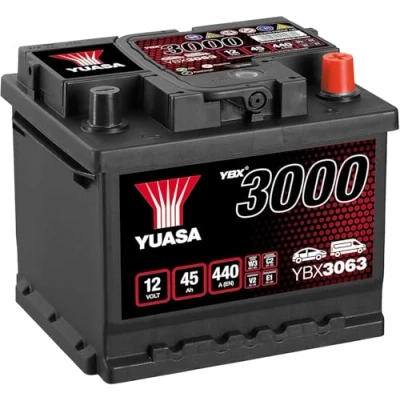 SPECIFICATIONS: 12V SMF High performance Battery; Capacity: 45 Ah; Startup Power (CCA): 450 Amps; Size (mm): 207 x 175 x 175; Weight (kg): 11.5; Brass terminals (Type 1) to enhance conductivity and optimise overall battery performance. UP TO 30,000 ENGINE STARTS: Built to endure up to 30,000 engine starts, the Yuasa YBX3063 offers long-lasting reliability and performance for everyday vehicles. WIDELY COMPATIBLE: The Yuasa YBX3063 ensures reliable operation across various driving conditions and is compatible with various vehicle makes such as: Volkswagen ,BMW ,Audi ,Kia ,Ford & many more FOR STANDARD POWER DEMANDS: Ideal for vehicles with standard power needs, providing consistent and efficient power for regular driving conditions. VIBRATION AND SHOCK PROOF: Built to withstand various driving conditions, ensuring stable power.