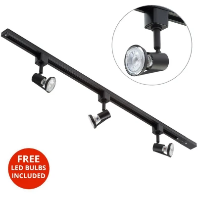 General description Have full control over your lighting with the 1 Metre Track Light Kit featuring 3 Harlem Heads and LED Bulbs in Black. This kit includes three Harlem-style spotlight heads that can be moved along the track and adjusted to shine in different directions, making it a perfect solution for kitchens, dining rooms, hallways, and office spaces. The sleek black finish adds a modern touch to contemporary homes. Technical specifications Product Type: Track Light Spot Head Colour: Black Light Bulb Type: GU10 Bulbs Required: 3 (Included) Bulb Wattage: 8 Watt Light Source: LED Length: 1 Metre Width: 3.3 cm approx. Material: Metal Compatibility and accessories Spotlight heads are compatible with LED or halogen bulbs (GU10) Connectors available to create straight or L-shaped variations
