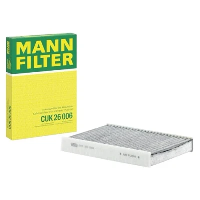 MANN-FILTER Cabin Air Filter CUK 26 006 / Dimensions (mm): A = 254; B = 182; H = 35 / Premium Filter in Original Equipment Quality High-quality MANN-FILTER cabin filters with active carbon - nearly 100% protection from particles like pollen, diesel soot & tyre abrasion / Additional protection from harmful gases & unpleasant odour The trated highly-effective activated carbon gives protection against harmful gases such as ozone, nitrogen oxide or sulphur dioxide and eliminates unpleasant odours during the entire service interval Looking to find the correct filter? Select: brand, model, vehicle type, and engine type above to see which one fits your vehicle MANN+HUMMEL complies with REACH-regulation + supports the goal of Improved health and safety through the design, manufacturing, usage, disposal and recycling of our products