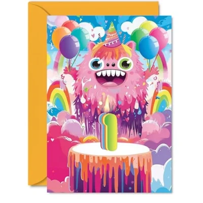 Delight little ones with our vibrant Happy Birthday Card! Featuring a little monster party with a birthday cake and vibrant colours with the message 'Happy Birthday 1' this premium-quality card is perfect for celebrating a first birthday. Its bright colors and playful theme make it a memorable keepsake, designed to bring joy and smiles on their special day. Crafted with care, it’s more than just a card—it’s a heartfelt way to celebrate their milestone! What's Inside: Open up to a cheerful message, "Have A Monsterific Day," perfect for celebrating a child's birthday! With plenty of space for your personal note, this card is printed on a durable 360-micron environmentally friendly board for a premium feel. The one-sided gloss finish enhances the vibrant design, and it comes paired with a colorful gummed envelope that perfectly matches the playful theme—making it an unforgettable birthday surprise! Ink Perfection: Enjoy a smooth writing experience with our high-quality one-sided coated board, designed to prevent ink smudges. The uncoated side absorbs ink effortlessly, ensuring your message looks perfect every time. Crafted for premium quality, this card adds a touch of charm and practicality, making it ideal for kids' birthdays. Say it in style with a flawless finish that's as delightful as the occasion! Perfect Dimensions: Make an impression with a card sized at 148mm x 210mm, paired with a matching envelope measuring 150mm x 212mm. Crafted on sturdy 360-micron board, this card offers a premium feel and lasting quality. The ideal size for a child's birthday greeting, it's both fun and practical—perfect for adding a personal touch to their special day! British Craftsmanship: Proudly crafted and quality-checked in the UK, our birthday cards are a testament to expert design and manufacturing. Utilizing Forest Stewardship Council certified board, we contribute to responsible forest management. Expect a swift turnaround and a product that reflects the highest standards of quality.