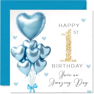 1st Birthday Cards for Boys Blue Glitter Balloons Happy Card 1 Year Old Boy Cousin Grandson Great Nephew Step Son, 145mm Bday Greeting