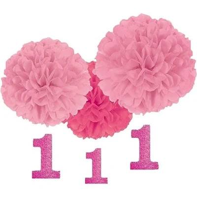 Product includes: 3 x hanging decorations Product features hot pink, and baby pink hanging pom poms. Each pom pom is attached with glitter cutouts of the number "1". Perfect for first birthday celebrations. Made of tissue paper and cardstock