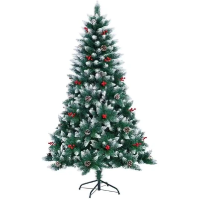 2.1m (7Ft) Flocked Artificial Christmas Tree with 1014 Pencil Tips Balmoral Fir Snowy Branches, Berries and Pine Cones Decorations Metal Stand Bushy Luxury Xmas Home Centerpiece