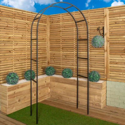 Create an elegant focal point in your garden with this tall classic metal garden arch. A timeless feature that brings structure, height, and charm to any outdoor space. Whether placed over a garden path, framing an entrance, or enhancing a flower bed, this archway creates an instant focal point while supporting lush, vertical growth that transforms your garden into a romantic retreat.. Standing an impressive 228cm tall and 110cm wide, the arch features sturdy square-section side supports that not only add structural integrity but also provide an ideal surface for plants to cling and climb. Its sleek black finish complements both classic and contemporary garden styles. Expertly crafted from durable steel with a black powder-coated finish, this traditional garden arch offers both beauty and strength for long-lasting use in all seasons.. Supplied flat packed and self assembly is required.. Product Specifications. Height: 228cm Width: 110cm