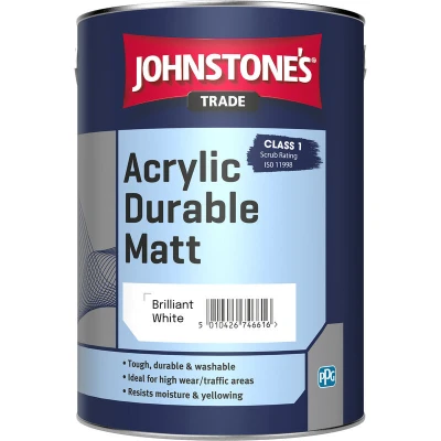 General description Johnstone's Trade Acrylic Durable Matt is designed for use on interior walls and woodwork, including surfaces susceptible to condensation. Its hard, non-yellowing, smooth finish makes it easier to clean than conventional emulsions, making it ideal for high wear and traffic areas. This paint features a mould-resistant formulation and a Class 1 Scrub Rating of ISO11998, ensuring durability and longevity. Technical specifications Type: Water Based Finish: Matt Coverage: 11-13 square metres per litre (depending on surface nature and porosity) Recoat time: 3-4 hours Maximum coverage: up to 16 square metres per litre Compatibility and accessories Suitable for primed woodwork and radiators Can be applied on blockwork, brickwork, cement render, concrete, plaster, and wallboards Installation Application methods: Brush, Roller, and Spray