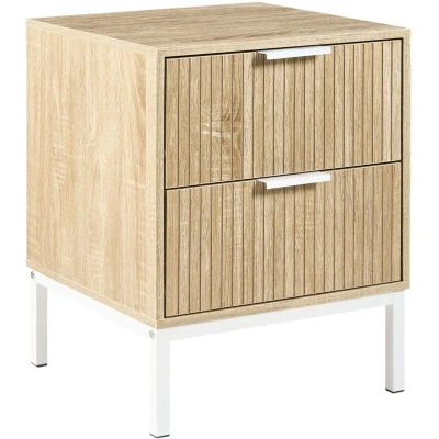 General description This contemporary nightstand combines style and practicality with its clean, modern design. Made from engineered wood with a wood-like finish, it features two spacious drawers for convenient bedside storage. The sleek metal legs and handles add a touch of sophistication, making it a perfect fit for any modern bedroom. Technical specifications Product Type: Bedside Table Style: Modern General Color: Brown, White Shade: Light Brown Main Material: Engineered Wood (MDF) Additional Material: Iron Legs Material: Engineered Wood Top Material: Engineered Wood Number of Drawers: 2 Weight: 10 kg Drawer Weight Capacity: 10 kg Top Weight Capacity: 60 kg Dimensions: Depth: 40 cm, Width: 40 cm, Height: 52 cm Installation Full Assembly Required Estimated Assembly Time: 45-60 min Usage Functional and capacious drawers Elegant design suitable for both a bedroom and a living room Stable and durable construction Exceptionally easy care Other information Maintenance tips for MDF: