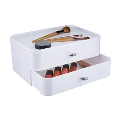 Stylish, this cosmetics organizer has a white and gray finish which gives it an elegant and stylish look. This organizer is very modern and chic. Durable, this makeup organizer is made from sturdy PP- Polypropylene plastic material which makes it extremely durable and sturdy. Ample storage, this cosmetics organizer comes with 2 pull out drawers which can store a wide array of cosmetic products and brushes. Convenient, this cosmetics organizer is lightweight and its top has raised edges to display accessories appropriately and conveniently. The complete dimensions of this white cosmetics organizer are W26 x D19 x H12 in centimeters. The organizer is very spacious.