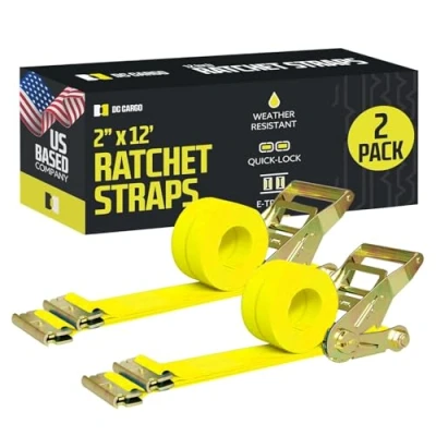 SECURE AND SAFE - These 2" x 12' Heavy Duty Ratcheting Logistic Cargo Tie-Down Straps have an assembly break strength of 3,000 pounds and a Safe Working Load Limit of 1,000 Pounds. Easily Secure Cargo Loads In Your Box Truck, Cargo Van, Pickup Bed, Flatbed/Utility Trailer, Enclosed Trailer, or Warehouse With The Convenient And Versatile E-Track System; each yellow E-Track strap tie down has E-Track spring fitting attachments at each end that click into slots on your E-Track rails or singles DURABLE - Never replace your straps again! These Ratchet Tie-Down Cargo Straps are made out of durable yellow polyester webbing (strap material) that is water- and UV ray- resistant. They won't shrink or stretch even when wet. The steel ratchet is made to ensure the most reliable trailer and truck cargo securement throughout the bumpiest rides. EASY TO USE - See the image for 6 Easy How-To Steps. 1. Open the ratchet by lifting the lever and threading the loose strap end around the bottom rod of the spindle (ratchet handle) 2. Pull the excess webbing through and pump the strap tight until it is wrapped securely around your cargo load 3. Clip the lever down and your load is secure! PROTECT YOUR PROPERTY - These Tie Down retractable ratchet straps Are Made Out Of The Most Reliable Materials Available With The Highest Standard Workmanship; click the images to see more ways to use these fabulous E-Track Tiedown Cargo Tork Strap Straps for trucks, trailers, vans, sailboats, kayaks, cars, motorcycles, RVs, and other tie down needs USA BASED COMPANY - American Service, American Quality, along with our DC Cargo 100% satisfaction guarantee