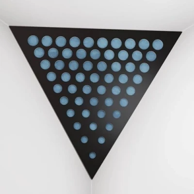 2 Pack — Ceiling Corner Bass Trap "Triangle F" Triangular Pyramid Acoustic Foam with Perforated Laminated HDF Plate and Fabric 42x42x42cm [ ROUNDS Black Blue ]