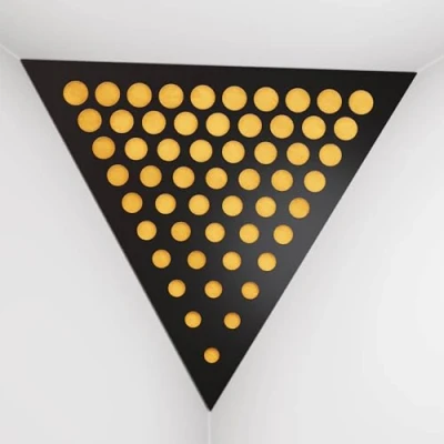 2 Pack — Ceiling Corner Bass Trap "Triangle F" Triangular Pyramid Acoustic Foam with Perforated Laminated HDF Plate and Fabric 42x42x42cm [ ROUNDS Black Yellow ]