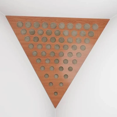 2 Pack — Ceiling Corner Bass Trap "Triangle F" Triangular Pyramid Acoustic Foam with Perforated Laminated HDF Plate and Fabric 42x42x42cm [ ROUNDS Cherry Beige ]