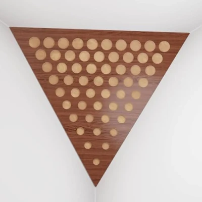 2 Pack — Ceiling Corner Bass Trap "Triangle F" Triangular Pyramid Acoustic Foam with Perforated Laminated HDF Plate and Fabric 42x42x42cm [ ROUNDS Nut Gold ]