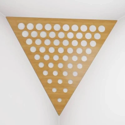 2 Pack — Ceiling Corner Bass Trap "Triangle F" Triangular Pyramid Acoustic Foam with Perforated Laminated HDF Plate and Fabric 42x42x42cm [ ROUNDS Oak White ]