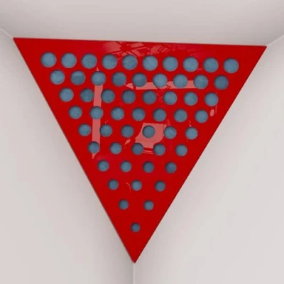 2 Pack — Ceiling Corner Bass Trap "Triangle F" Triangular Pyramid Acoustic Foam with Perforated Laminated HDF Plate and Fabric 42x42x42cm [ ROUNDS Red plastic Blue ]
