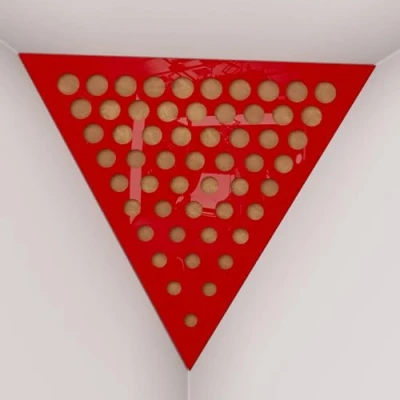 2 Pack — Ceiling Corner Bass Trap "Triangle F" Triangular Pyramid Acoustic Foam with Perforated Laminated HDF Plate and Fabric 42x42x42cm [ ROUNDS Red plastic Gold ]