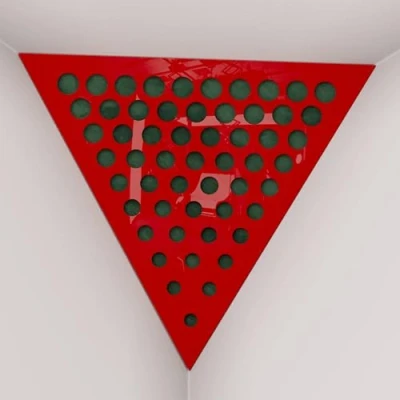 2 Pack — Ceiling Corner Bass Trap "Triangle F" Triangular Pyramid Acoustic Foam with Perforated Laminated HDF Plate and Fabric 42x42x42cm [ ROUNDS Red plastic Green ]