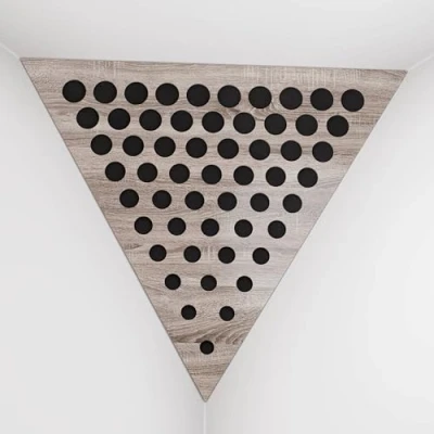 APPLICATION: These acoustic bass traps, made of high-density fiberboard with sound-absorbing materials, excel in the low and mid frequency ranges. Typically installed in the upper corners between the wall and ceiling, they are used in recording studios, home entertainment centers, music studios, corporate offices, training rooms, concert venues, conference rooms, canteens, hotels, residences, religious institutions, recreational facilities, and broadcasting studios. ACOUSTIC IMPROVEMENT: Improve the acoustics of your room with our premium acoustic сorner bass traps. These bass traps offer superior sound control by effectively absorbing sound and reducing echo in any environment. Unlike traditional foam bass traps, our solutions provide significantly improved performance. Choose from a variety of unique designs and colors to perfectly complement your interior. CHARACTERISTICS: -Combination of absorption and diffusion - Absorption is effective for mid and low frequencies - Overall Noise Reduction Coefficient (NRC) of 0.53 - Power Dissipation Range: 160 Hz to 5,000 Hz - Material composition: laminated high density fiberboard (HDF) and acoustic foam - Dimensions: Front Triangle Side: 42 cm (16.5 inches) | Corner Depth: 32 cm (12.6 inches) These products are sold in sets of two. MOUNTING OPTIONS: Each bass trap is supplied with "double-sided adhesive tape" for easy corner installation. Optimum fastening is achieved by using a construction adhesive, commonly known as "liquid nails". CAREFUL SERVICE: Ensuring your satisfaction is our top priority! Every purchase is backed by a money-back guarantee. Your happiness is directly linked to our clients' happiness. If you have any questions or concerns, don't hesitate to contact us. We will respond quickly! Your satisfaction is always our first concern.