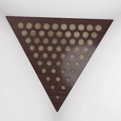 2 Pack — Ceiling Corner Bass Trap "Triangle F" Triangular Pyramid Acoustic Foam with Perforated Laminated HDF Plate and Fabric 42x42x42cm [ ROUNDS Wenge Beige ]