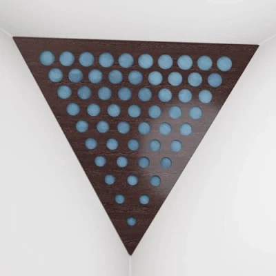 2 Pack — Ceiling Corner Bass Trap "Triangle F" Triangular Pyramid Acoustic Foam with Perforated Laminated HDF Plate and Fabric 42x42x42cm [ ROUNDS Wenge Blue ]