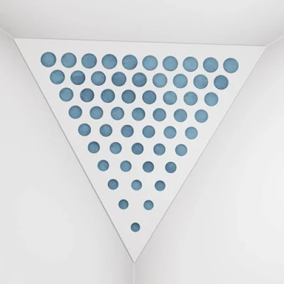 2 Pack — Ceiling Corner Bass Trap "Triangle F" Triangular Pyramid Acoustic Foam with Perforated Laminated HDF Plate and Fabric 42x42x42cm [ ROUNDS White Blue ]