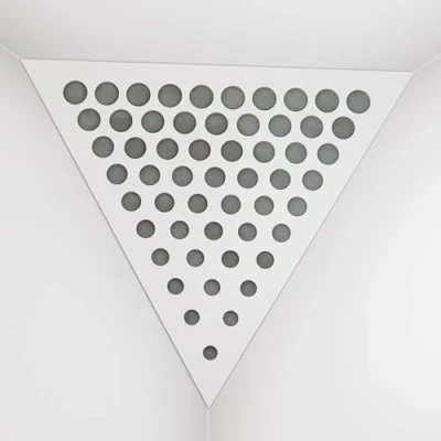 2 Pack — Ceiling Corner Bass Trap "Triangle F" Triangular Pyramid Acoustic Foam with Perforated Laminated HDF Plate and Fabric 42x42x42cm [ ROUNDS White Grey ]