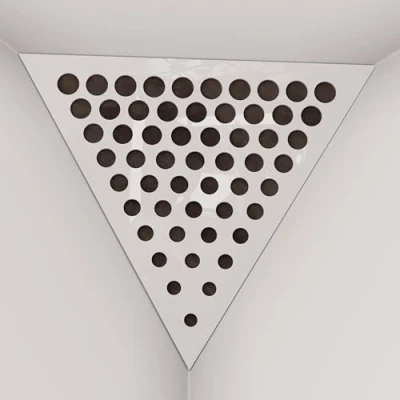 2 Pack — Ceiling Corner Bass Trap "Triangle F" Triangular Pyramid Acoustic Foam with Perforated Laminated HDF Plate and Fabric 42x42x42cm [ ROUNDS White plastic Brown ]