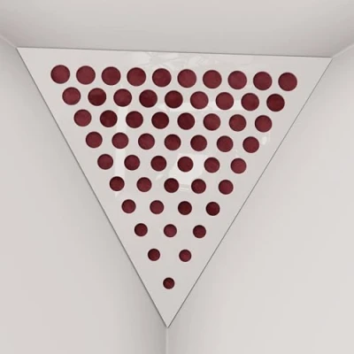 2 Pack — Ceiling Corner Bass Trap "Triangle F" Triangular Pyramid Acoustic Foam with Perforated Laminated HDF Plate and Fabric 42x42x42cm [ ROUNDS White plastic Burgundy ]
