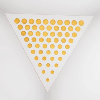 2 Pack — Ceiling Corner Bass Trap "Triangle F" Triangular Pyramid Acoustic Foam with Perforated Laminated HDF Plate and Fabric 42x42x42cm [ ROUNDS White Yellow ]