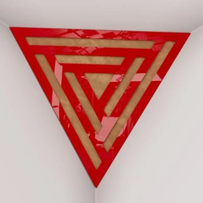 2 Pack — Ceiling Corner Bass Trap "Triangle F" Triangular Pyramid Acoustic Foam with Perforated Laminated HDF Plate and Fabric 42x42x42cm [ SCIFI Red plastic Gold ]
