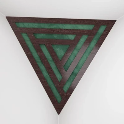 2 Pack — Ceiling Corner Bass Trap "Triangle F" Triangular Pyramid Acoustic Foam with Perforated Laminated HDF Plate and Fabric 42x42x42cm [ SCIFI Wenge Green ]
